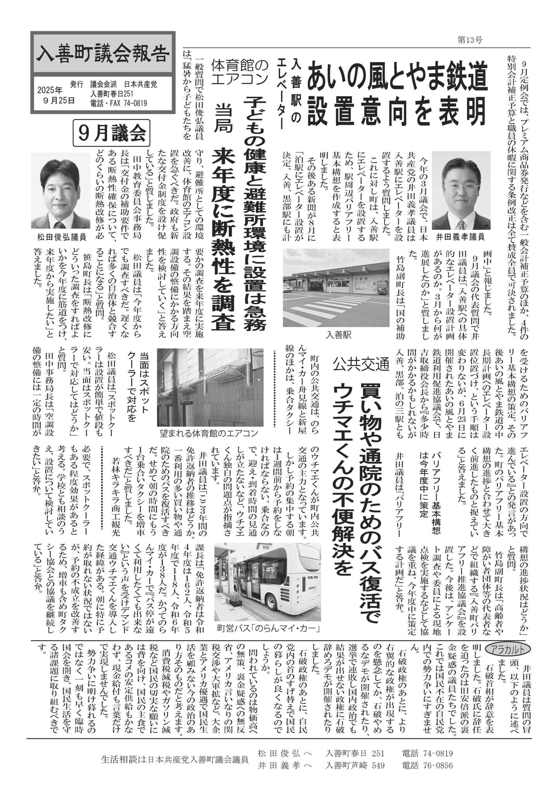 ・当面はスポットクーラーで対応を。買物や通院のためのバス復活でうちまえクンの不便解消を